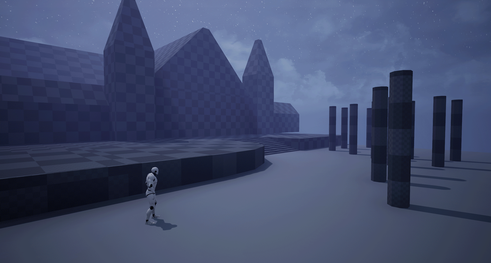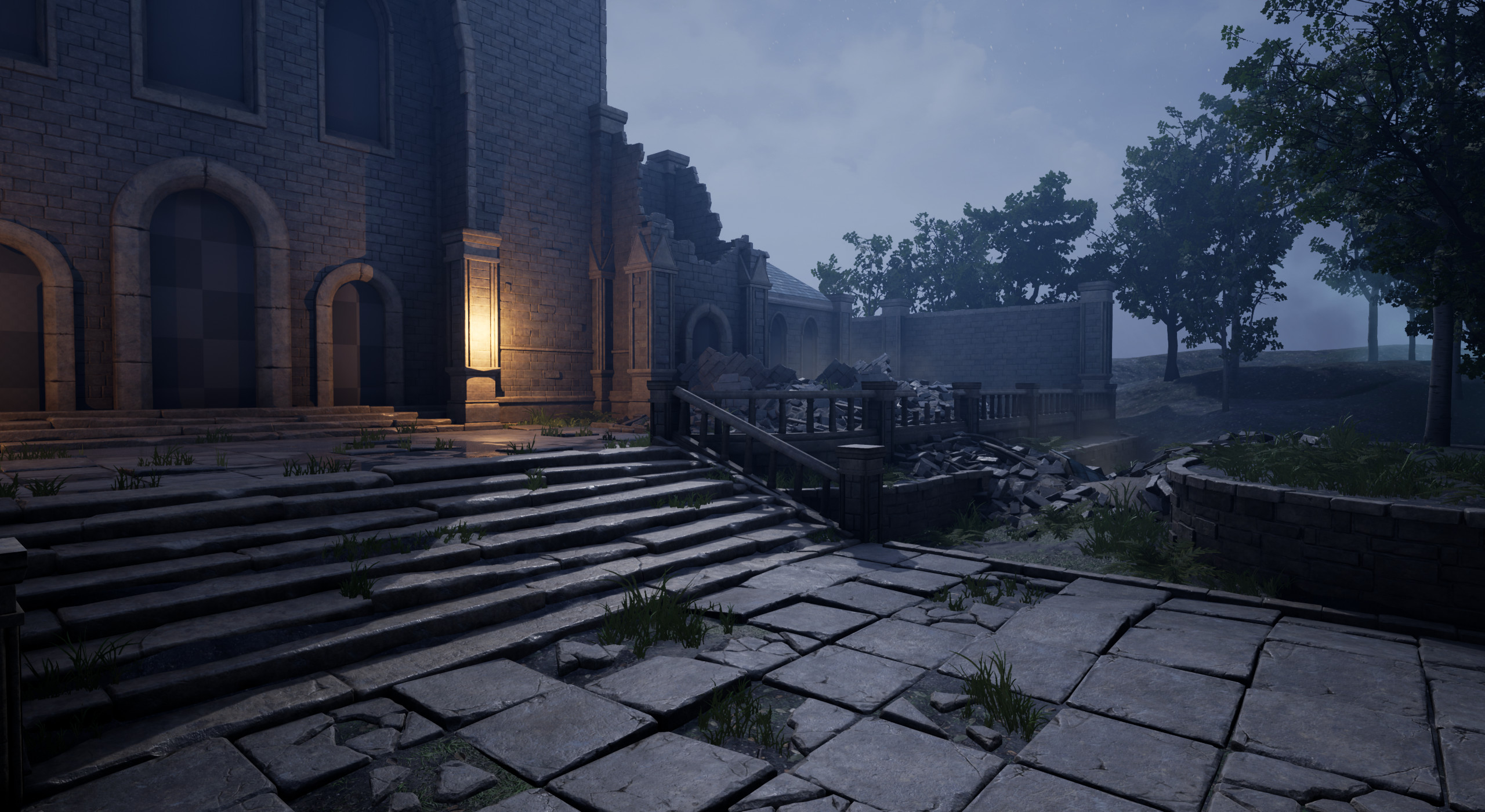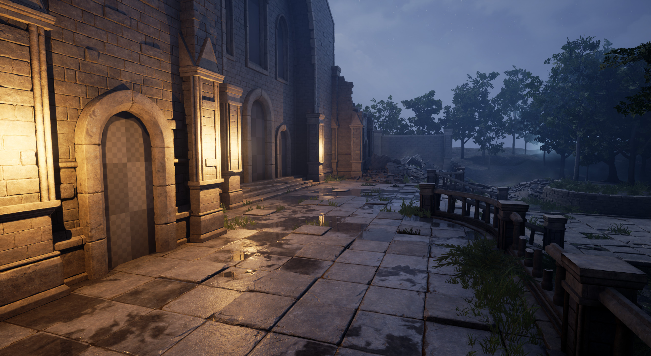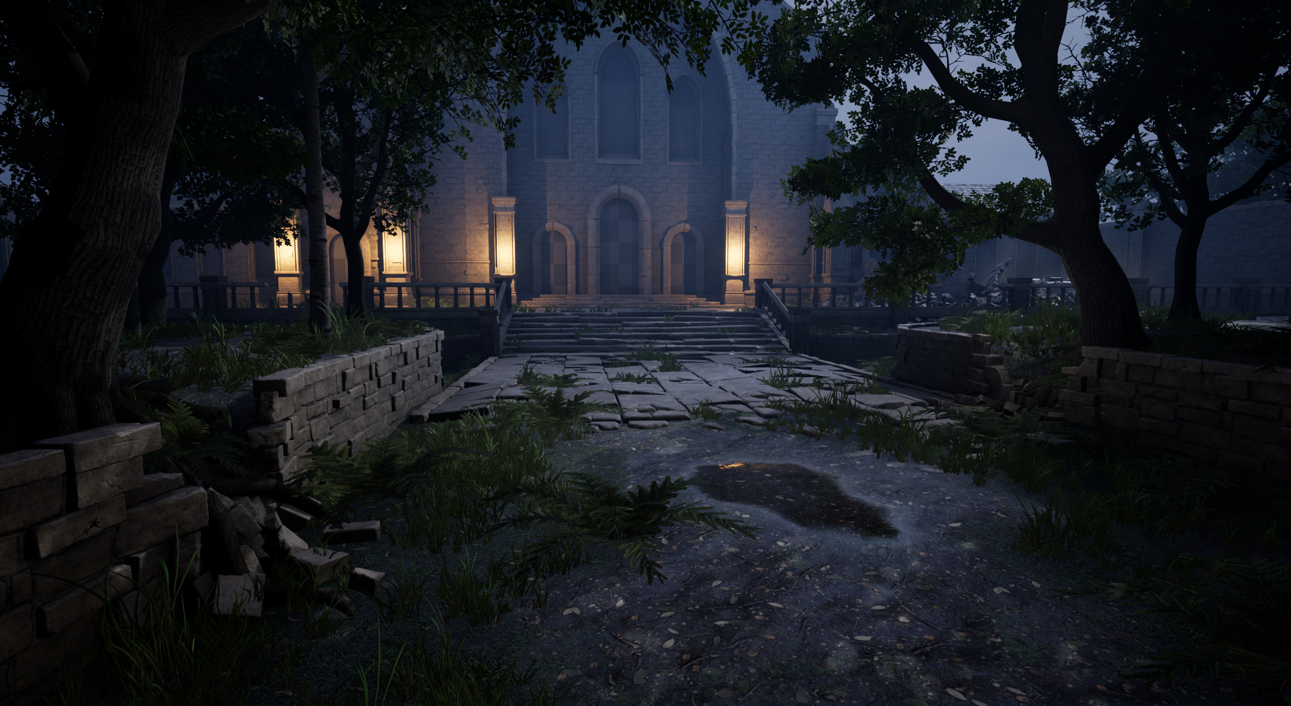 Work in progress of a cathedral scene I've been working on my free time. Started blocking out basic shapes, planning player path, lighting, and composition. All textures and modeling are done by me. (Art not final)